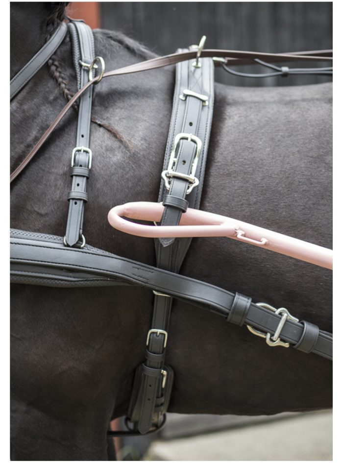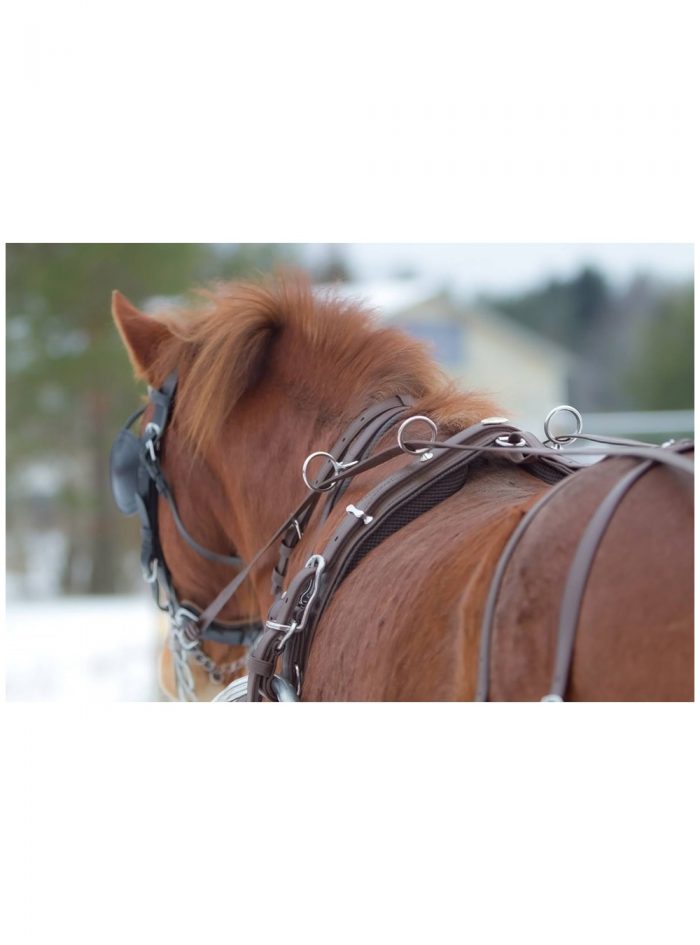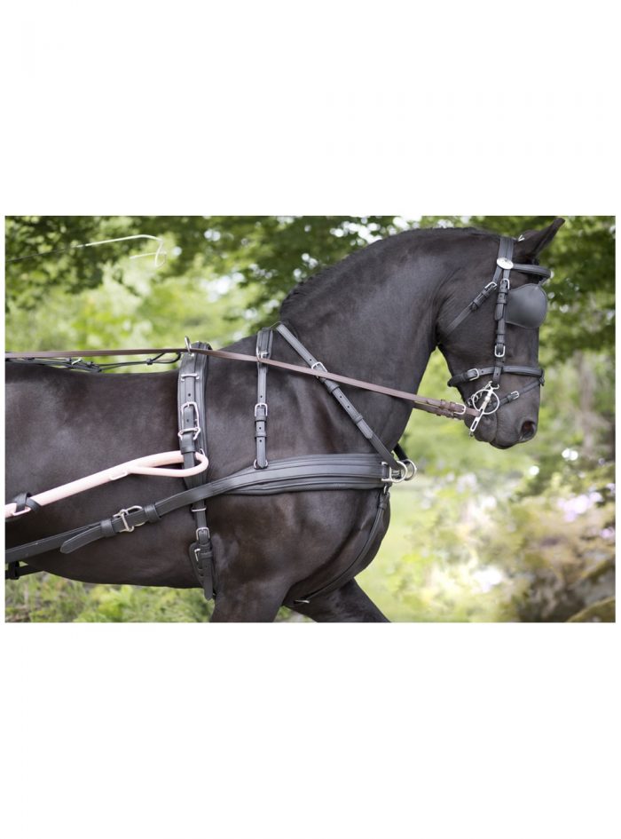 Esta guarnición de bajo mantenimiento está hecha de un material sintético fuerte y maleable. Con unos pequeños ajustes y añadiendo unas piezas complementarias, esta guarnición se puede utilizar como limonera , tronco, cuarta y tándem.